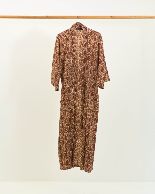 シルクコットンのガウンは、心地よさとスタイリッシュさを兼ね備えたアイテムです。 女性らしさを引き立てるデザインで、リラックスタイムやちょっとしたお出かけにも最適です。 シルクとコットンをブレンドした素材で、柔らかな肌触りと軽やかさが魅力です。ネットに入れてお洗濯すれば洗濯機でもお手入れ可能なので、忙しい日常にも大変便利です。乾燥機は避けて頂くと、より長く美しい状態を保てます。 また同じ柄の袋に入れてお届けしますので、ギフトとしても喜ばれること間違いなしです。 シワになりにくく持ち運びも便利なので、旅行やお家でのリラックスタイムにもぜひ! 手作りの特性から個体差がございますので、風合いを楽しむことができる方にお勧めしています。糸の不始末や多少の縫製のズレ、縫製時のペンの印などがある場合がございます。ペンの印についてはお洗濯で取り除くことが出来ます。袋の洗濯は形が崩れる事がありますのでオススメしません。諸々ご了承の上でのお買い上げを心よりお待ちしております。 素材:シルク、コットンMIX 生産地:インド サイズ:FREE モデル着用:162cm FREEサイズ 着丈:123cm 肩幅:51cm 袖丈:39cm (海外製品のため個体差あり) ベルトループ付きで紐が付属 右側にポケットあり *請求書をご希望の方は、ご注文時「備考欄」にその旨と宛名、但書をご記入ください。